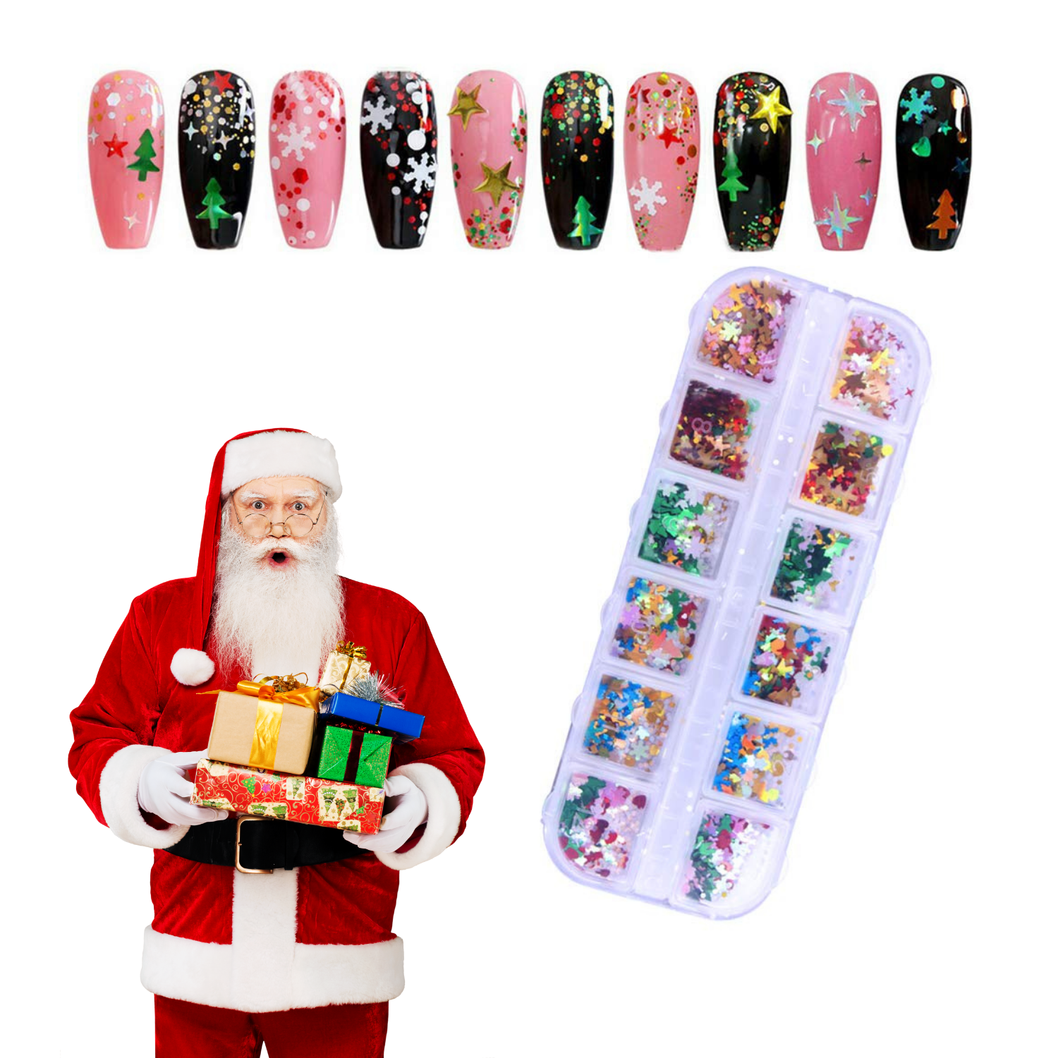 Luce unas uñas festivas y elegantes con nuestra decoración de Navidad para uñas. Incluye 12 estilos diferentes para crear diseños únicos y deslumbrantes. Perfecta para añadir un toque navideño a tu manicura. ¡Dale a tus uñas un estilo festivo y encantador esta temporada!